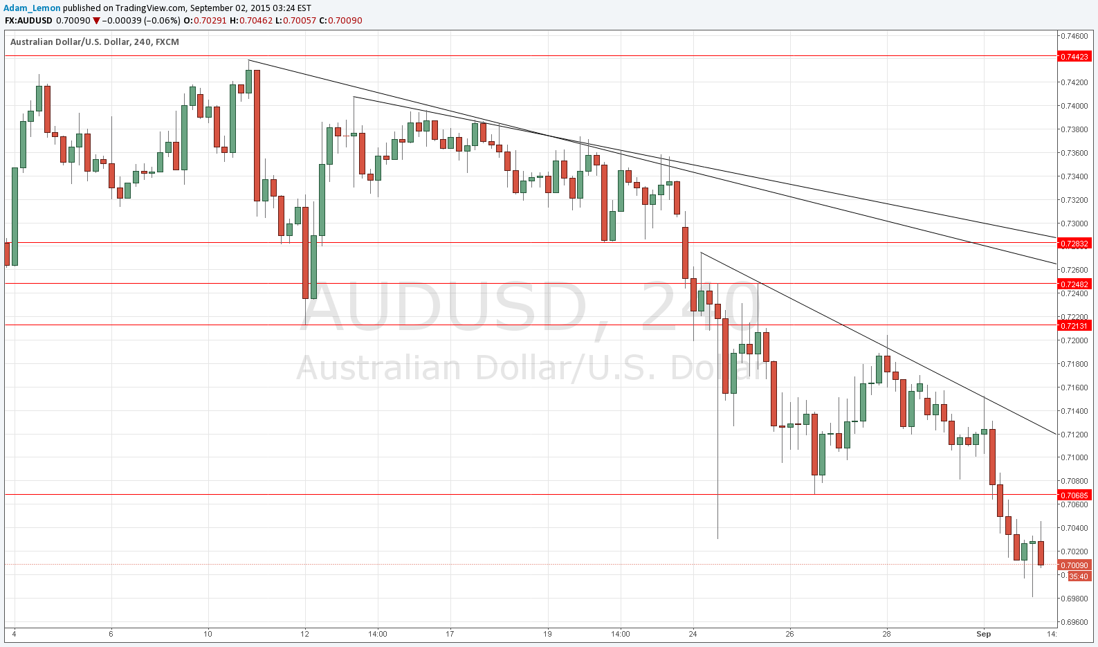 I wrote yesterday that this pair was looking very bearish, with the major problem being the absence of any meaningful pull-backs to give a good short entry. Things have continued in this vein over the past 24 hours, with a new multi-year low being made, and at the time of writing, the price is below the low of last week’s spike down. The price has also made an excursion below the psychologically key 0.7000 level and looks likely to get down there again. So overall everything looks very bearish, and if the USD news coming up is strong, you can expect a further steep fall in this pair.