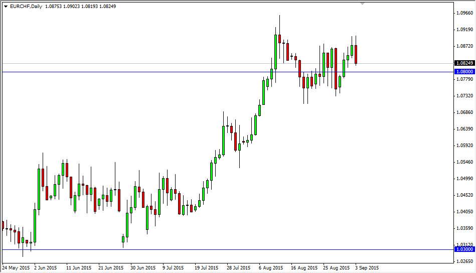 The EUR/CHF pair initially tried to rally during the course of the day on Thursday, but found enough resistance near the 1.09 level to turn things back around and fall towards the 1.08 level. With that being the case, I now believe that we are heading back towards the bottom of the consolidation area, somewhere near the 1.07 level. Ultimately, the European Central Bank suggesting that perhaps there will be more quantitative easing in the future brought down the value the Euro, but you have to keep in mind that there are a lot of forces at work in this pair.