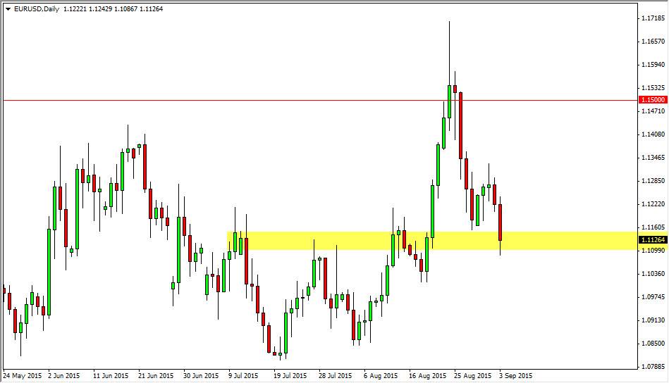 The EUR/USD pair fell significantly during the session on Thursday, crashing towards the 1.11 level. That is an area that should be supportive, and as a result we did in fact bounce from there. That suggests to me that we are going to continue to see buyers and sellers both in this marketplace, even though the European Central Bank suggested that perhaps they will extend more stimulus to cause inflation in the European Union. That of course is negative for the Euro, but at the end of the day we still have the jobs number coming out today, and that of course can move this market in the exact opposite direction in the blink of an eye.
