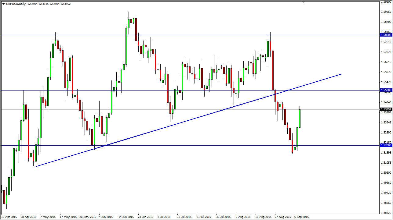 All of that being said, I am waiting to see if I get a candle such as a shooting star on the 4 hour chart or above as the market will have exhausted itself. If we got a daily close significantly above the 1.55 handle, then I would be convinced that the market should head to the 1.58 level given enough time. However, at this point in time I still think that the sellers are going to be in control before it’s all said and done.