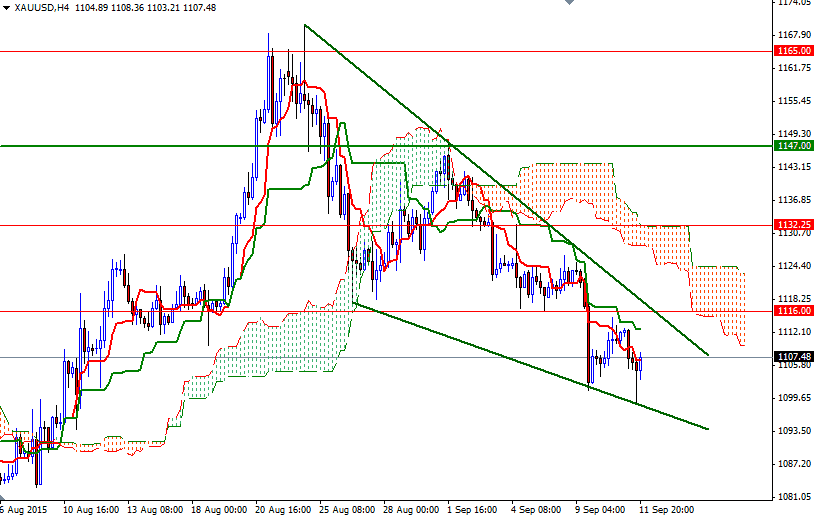 Gold prices settled at $1107.48 per ounce, falling nearly 1.42% over the course of the week, as calmer financial markets and generally positive U.S. economic data eased demand for the perceived safety of the metal. The XAU/USD pair dipped to a low of $1098.69, a level last seen on August 11, before bouncing back to the $1107 area. Gold has been struggling for some time because of the persistent improvement in U.S. data and perception that the likely timing of the first Fed rate increase since 2006 is drawing closer.