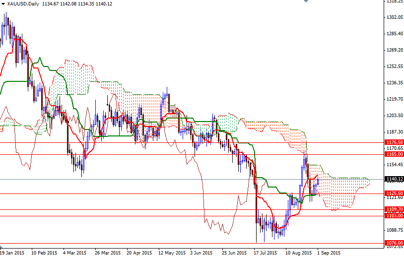 Gold prices initially fell on Monday but the expected support at the 1125.50 level which happens to be the daily Kijun-sen (twenty six-period moving average, green line) kicked in and pushed the market up. The XAU/USD pair continued to grind higher during today's Asian session as downbeat Chinese manufacturing data compounded fears of a sharper slowdown. While the official Purchasing Managers' Index came in at 49.7 in August, down from the previous month's 50.0, data compiled by Caixin/Markit showed the lowest reading since March 2009.