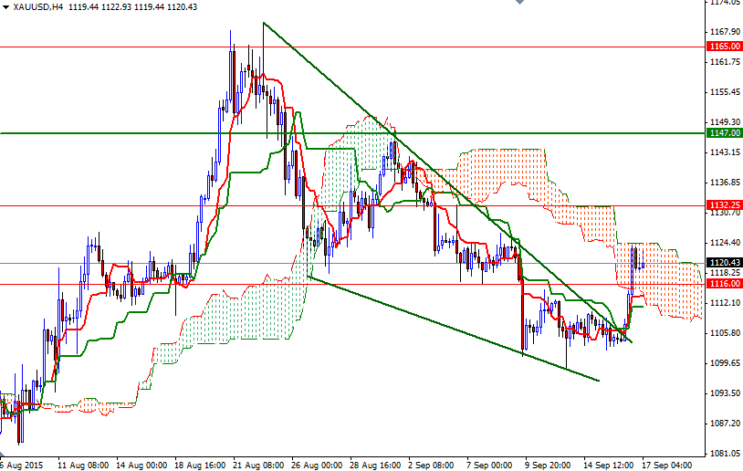 Market players are speculating that there is a distinct possibility that the Federal Reserve may hold off hiking interest rates until December. Although this view helps lift gold prices, gains in equity markets undermine the demand for safe-haven diversification. The market extended its gains and tested the resistance around the 1125.50 level after the XAU/USD pair broke out of the falling wedge and climbed above the first hurdle at 1116. Nonetheless, prices will probably tend toward consolidation, as traders await the outcome of the Federal Reserve's monetary policy meeting.