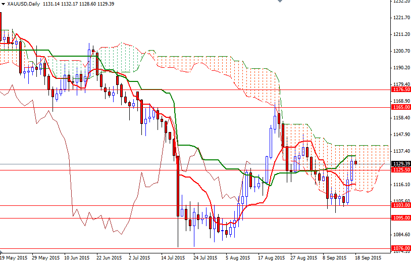 Yesterday's rally pushed the XAU/USD pair above the Ichimoku clouds on the 4-hour time frame. We also have a bullish Tenkan-sen (nine-period moving average, red line) - Kijun-sen (twenty six-period moving average, green line) cross. XAU/USD is currently hovering around the 1129 level as the market tries to digest the recent gains. From an intra-day point of view, I will be keeping an eye on the 1127/5.50 (resistance) area which was broken yesterday.