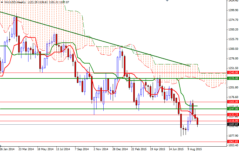 Gold prices ended Wednesday's session down 1.23% after a breach of the key support level at 1116 triggered a sell-off. The market initially tried to pass through the 1127/5.50 resistance area but encountered heavy resistance reversed its course. Not surprisingly, the XAU/USD pair accelerated its decline after the 1116 support was eliminated and eventually fell all the way back to the 1103 level.