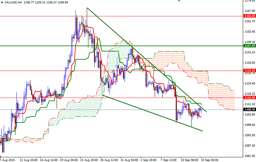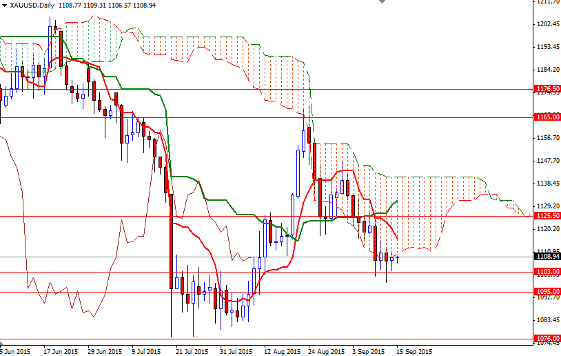 Gold settled up $1.31 at $1108.87 on Monday but remained within the trading range of the past 3 sessions as the market cautiously awaits the start of the Federal Open Market Committee meeting this week. Although the precious metal found some support from recently, people are reluctant to take sizable positions before they see the Federal Reserve's next move. Concerns that a slowdown in China's economy may be more harsh than initially thought and wild stock market gyrations have increased uncertainty about the timing of any U.S. rate increase.