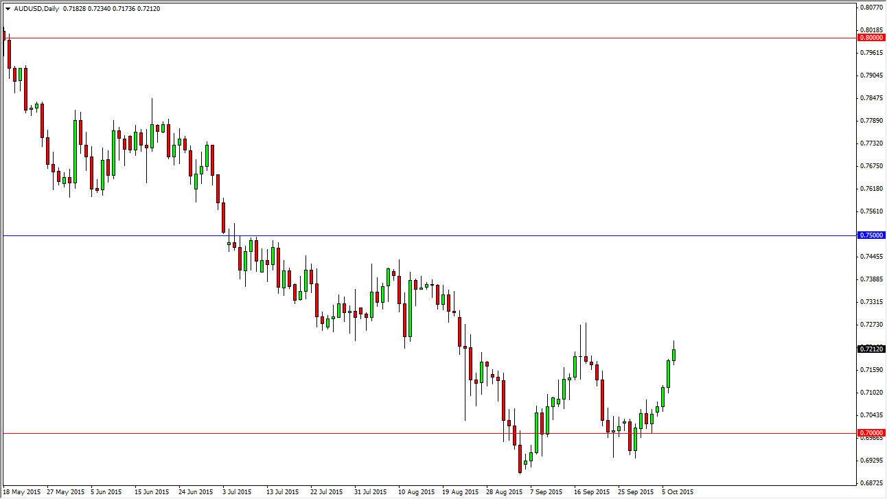 The AUD/USD pair rose during the course of the session on Wednesday, testing the 0.72 handle. We did break above there, but ultimately I still see a significant amount of resistance all the way to the 0.73 handle. This market is getting a little bit overextended at this point but I recognize that if we did break above the 0.73 level, we would have eventually seen quite a bit of selling pressure abated. With that being said, it’s very likely that this market will see a lot of volatility in the meantime, and I believe that the gold markets will of course assert its influence on the Australian dollar.