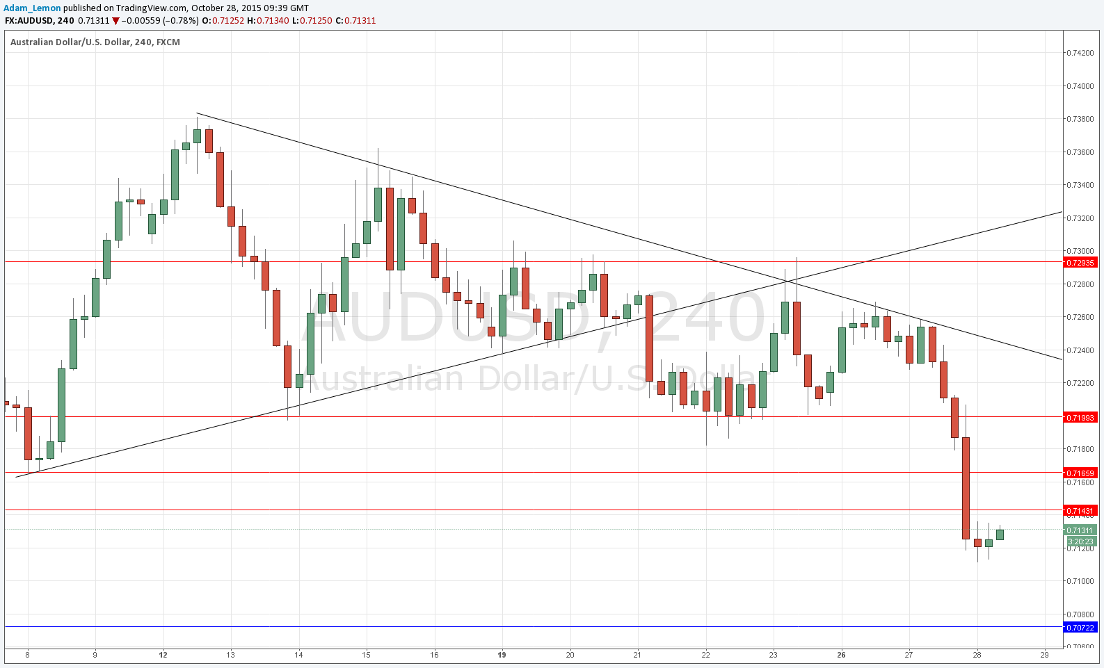 The technical picture is very interesting with both trend lines shown on the chart below having acted as good resistance during recent swings. We seem to be reversing off a rejection of the nearest trend line that happened earlier today near the beginning of the London session. It suggests a move down to test support at 0.7200 again, but it may be difficult to overcome the minor support that is probably there at around 0.7250.