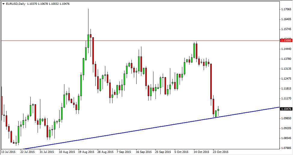 The EUR/USD pair initially fell during the session on Monday, as we continue to see softness in this particular currency pair. However, we bounced off of the 1.10 level and ended up forming a rather supportive looking candle. You have to keep in mind that the uptrend line from the ascending triangle on the longer-term charts also crossed the 1.10 level, and with that it’s probably going to mean that the buyers were very well aware of potential support. Quite frankly, if you waited for this type of supportive level, you have been very patient, but at the end of the day it means that the market should have to make some type of serious decision in this area. I believe that the uptrend line is essentially what needs to hold in order to keep any hope of a longer-term uptrend alive.