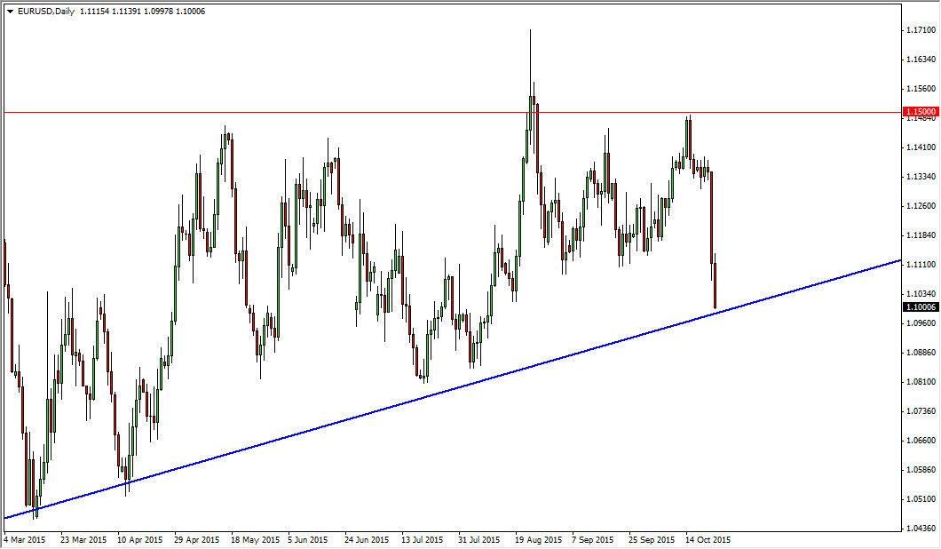 The EUR/USD pair fell again during the course of the session on Friday, testing the 1.10 level. That area also intersects with the uptrend line that has been part of the ascending triangle on the longer-term charts. With that, it’s very likely that the market will find a bit of support in this area. However, we closed at the very bottom of the range and that of course is very negative. That’s something I cannot overlook, so if we can break down below the bottom of the uptrend line, I think at that point in time the market will more than likely reach towards the 1.08 level, and then possibly even as low as the 1.05 level. I have no illusions that this market is falling apart at the moment, but at this point in time we have not broken down through the last vestiges of support quite yet.