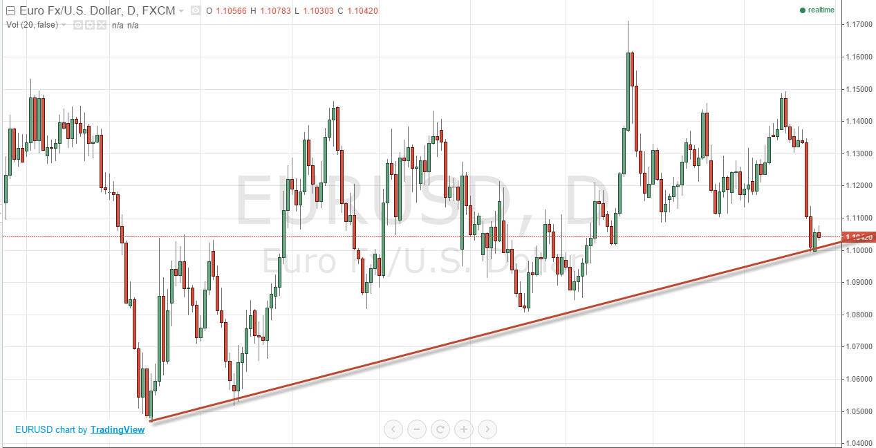 On the longer-term charts, I have an uptrend line intersecting at roughly 1.10 at the moment. This is the bottom of an ascending triangle that I think is quite important, and if we break down below that I don’t see a reason why the market will go down to the 1.08 handle. On the other hand, if we bounce from here we could continue to try to go higher, with the 1.11 level above being somewhat resistive, so I think that it is probably safer to buy this pair above that level and aim for 1.13 at the moment.