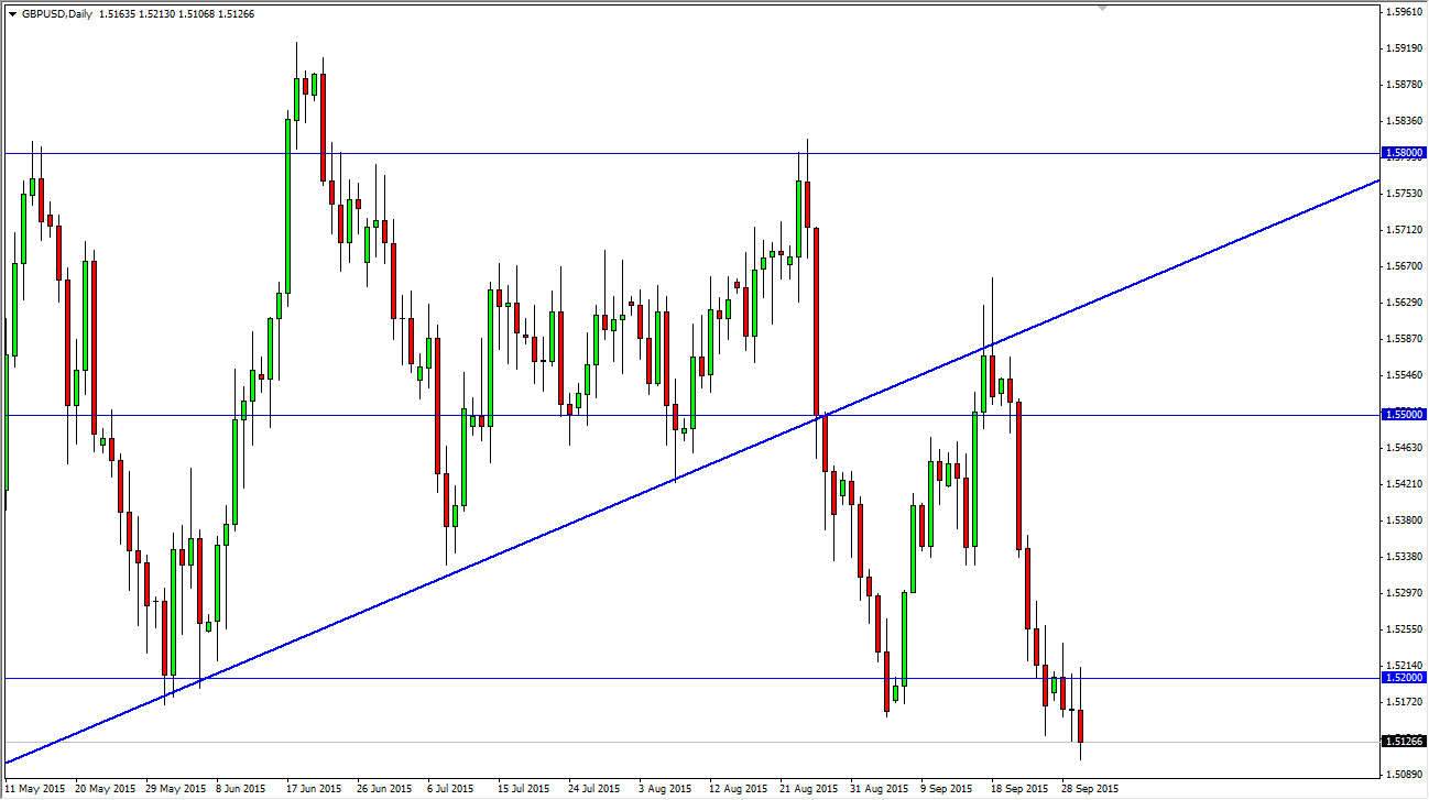 The GBP/USD pair initially tried to rally during the course of the day on Wednesday, but found the 1.52 level above to be far too resistive to continue going higher. Because of the fact that we found so much selling pressure there, I believe that we will continue to go lower. This was further confirmed later in the day as we broke below the lows of the Tuesday session, indeed a very soft sign. In fact, the 1.51 level is now the support level that we are dealing with, and I feel that it’s only a matter of time before we fall much farther, without a doubt heading to the 1.50 level next.