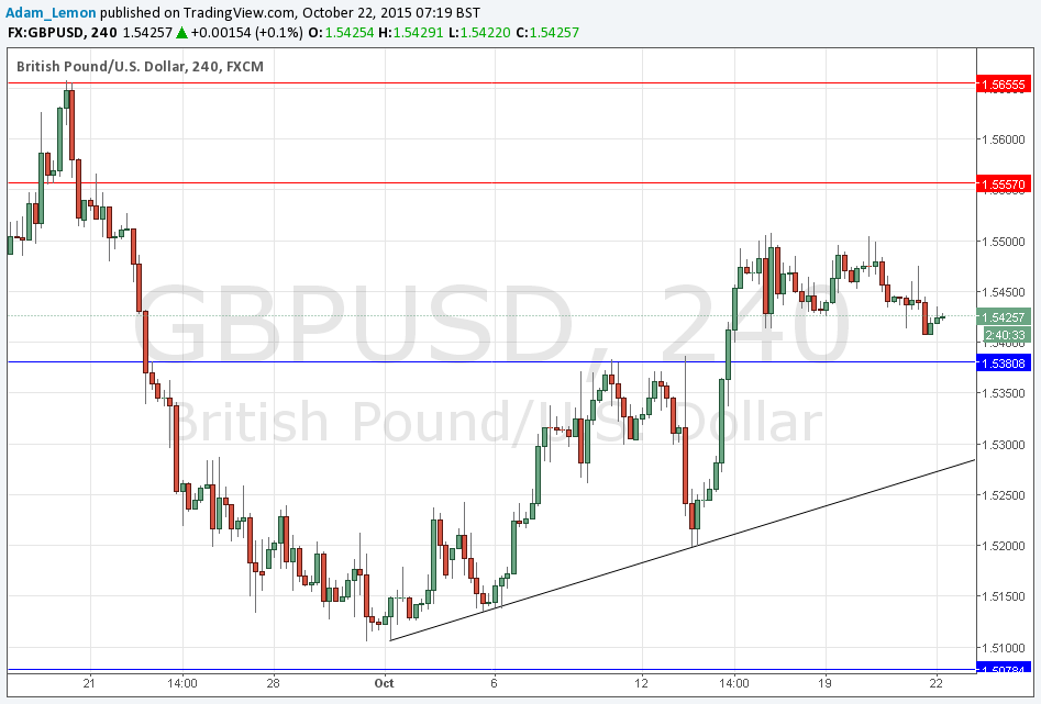 The price fell a little yesterday, but nothing important has changed. We have the same technical picture, key levels and trend lines as we had yesterday. The most interesting trade would look to be a long off the probable support at 1.5381 which is not very far away from the current price. Note that we have high-impact news due for both sides of this currency pair, so any directional move is possible.