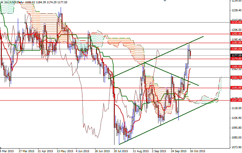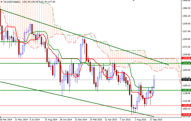 Gold prices ended Friday's session down $5.12, to settle at $1177.50 an ounce as a rebound in the dollar prompted some investors to lock in gains from a recent rally to a three-and-a-half-month high. In the latest economic data, the University of Michigan's preliminary reading on the overall index on consumer sentiment for October came in at 92.1, exceeding consensus estimates. The Federal Reserve's industrial production data was bleak but was more or less in line with market expectations. Despite Friday's losses, the precious metal ended the week with a gain of $21.72 as the possibility of a delay in raising interest rates helped the bulls push prices higher. Friday's data from the Commodity Futures Trading Commission (CFTC) showed that speculative traders on the Chicago Mercantile Exchange increased their net-long positions in gold to 117159 contracts, from 86819 a week earlier.