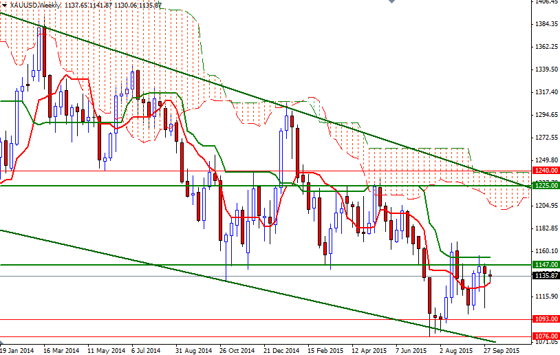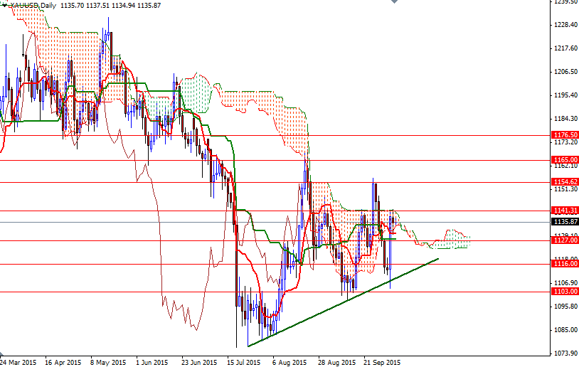 Gold prices ended Monday's session down $2.09 as investors took profits from a rally spurred by dreadful U.S. jobs data that pushed back expectations of an interest rate hike by the Federal Reserve to early 2016. In economic news yesterday, the Institute for Supply Management's non-manufacturing index came in at 56.9, down from the previous month's 59.0 and below expectations for a reading of 58.0 - more signs of weakness in the economy. The XAU/USD pair initially tested the support around the $1130 level where the daily Tenkan-Sen (nine-period moving average, red line) sits before making another attempt to break through the $1142 level. But as you can see the market encountered resistance and retreated to the current levels.