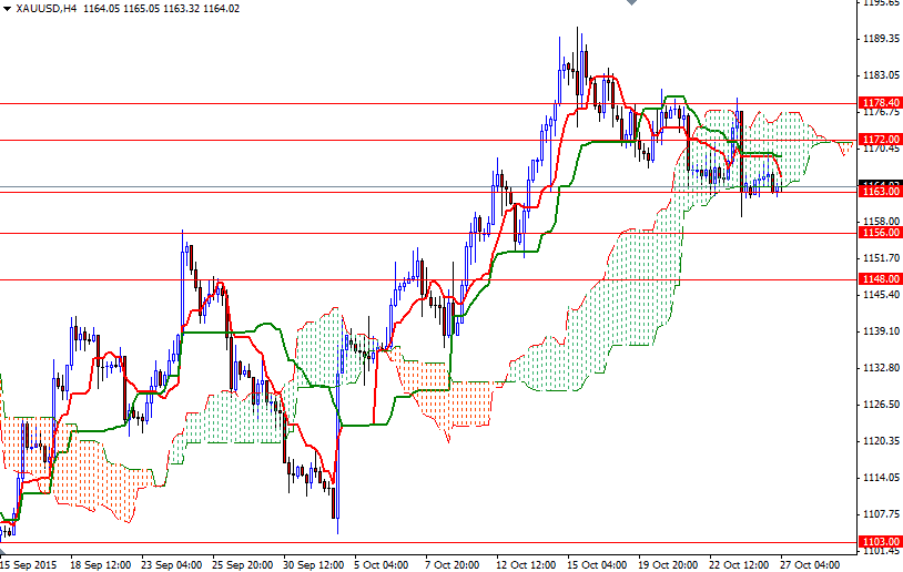It appears that we will tread water until the Fed announcement. However, today sees the release of durable goods orders and consumer confidence data so expect to see some volatility in the market. From a purely technical standpoint, the odds favor a range bound movement as the charts paint a mixed technical picture. Although XAU/USD is beyond the daily Ichimoku cloud and there is a positive Tenkan-sen (nine-period moving average, red line) - Kijun-sen (twenty six-period moving average, green line) cross, the 4-hourly cloud is right on top us and the Tenkan-sen is below the Kijun-sen. The initial support level stands at 1163, followed by 1161.80. If the bears take over and drag prices below 1161.80, it is likely that we will see the pair testing the next support in the 1156/2.70 zone. Falling through 1152.70 would imply that the market will be aiming for 1148 afterwards. The upward potential is likely to be limited by the resistance in the 1172/0 region, so we need to climb above there in order to march towards 1178.40. If the bulls gain more traction and successfully break through, then we are likely to proceed to 1185.