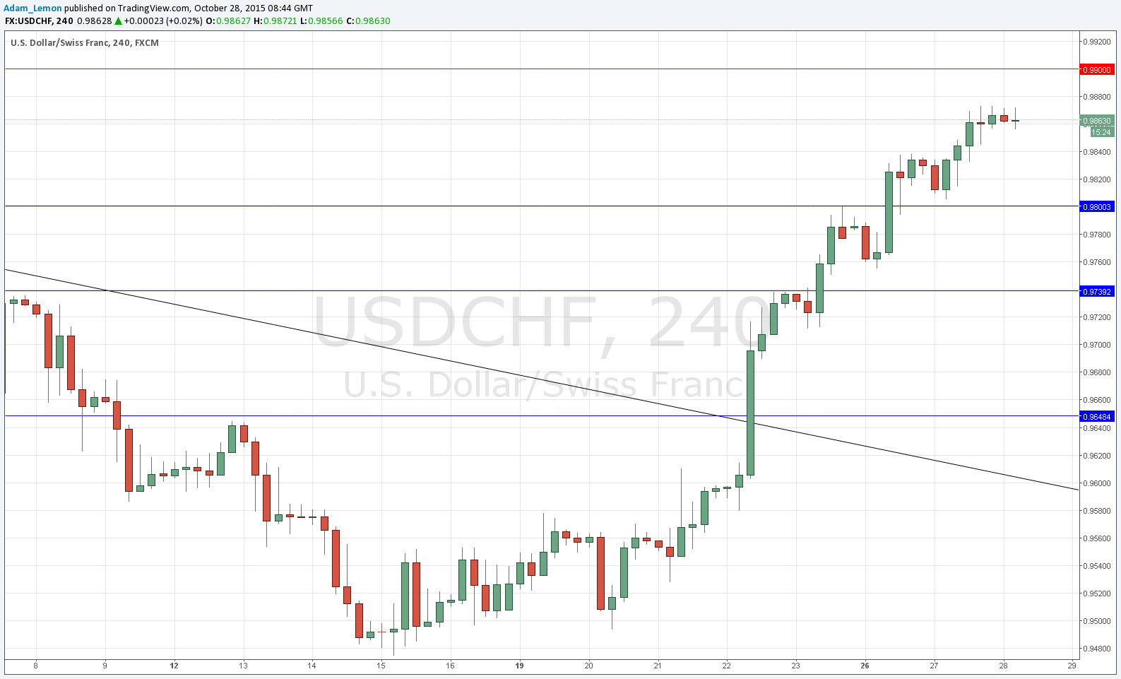 The CHF is the weakest currency around right now so it is that side of the pair that is really driving things. A USD-positive FOMC later today would make this the logical pair to be long of.