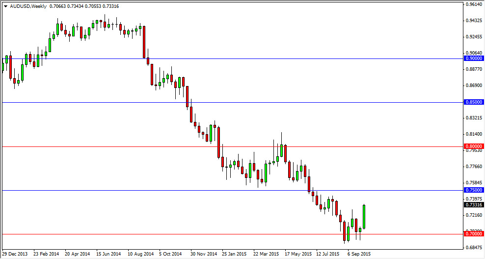 The AUD/USD pair broke higher during the course of the week, showing real strength. By doing so, I do think that we continue to go higher but the 0.75 level above is going to be resistive. With that, I think you’re going to have short-term buying opportunities on pullbacks, but at the end of the day the range for the week should be fairly quiet. I have no interest in selling at this point, just simply because I see so much in the way of noise below.