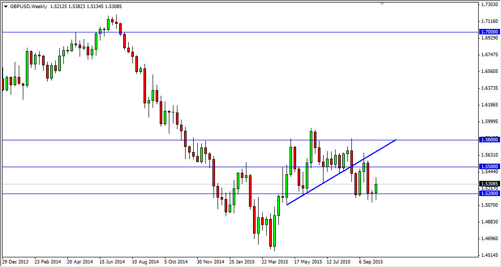 The GBP/USD pair initially fell during the course of the week but found enough support near the 1.52 level to turn things back around. Ultimately, we ended up forming a positive candle but at the end of the day I feel what’s happening is that we are simply looking to consolidate between the 1.52 level, and the 1.55 level above. Expect a lot of choppiness between here and there, and as a result I think that the market is probably going to be the domain of short-term range bound traders.