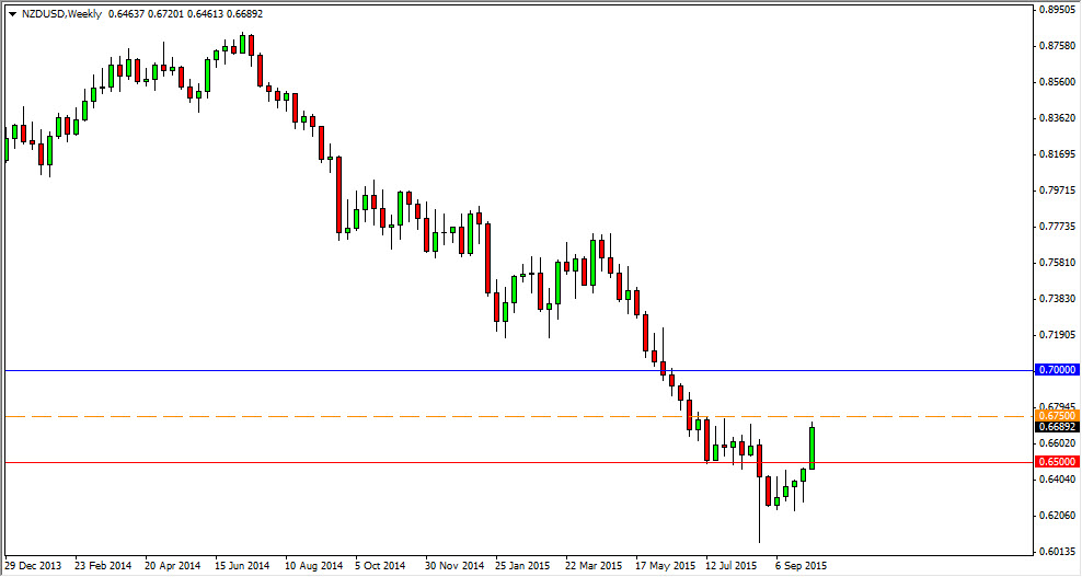 The NZD/USD pair broke higher during the course of the week, but stayed just below the 0.6750 handle. We need to get above there in order to see this market continue to go higher, and as a result I am still waiting for that move. As long as we stay below there I would be a seller of resistive candles. And as a side note, the Friday candle was a shooting star. A break down below the bottom of the Fridays range should be a selling opportunity. However, if we break above the orange dashed line on the chart, I feel that this market will probably reach towards the 0.70 level.