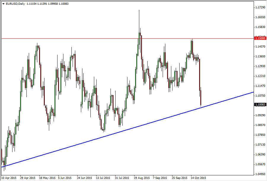 The EUR/USD pair fell significantly during the course of the week as the European Central Bank suggested that the market could expect a bit of stimulus coming forward. With that being the case, the Euro should continue to lose value, and we ended up crashing into the uptrend line at the 1.10 handle. With this being the case, I think that if we break down below the 1.10 level, the market should continue to drop down to the 1.08 handle, and then eventually the 1.05 handle. If we get some type of supportive daily candle though at the uptrend line, I could be convinced to buy on a bounce.