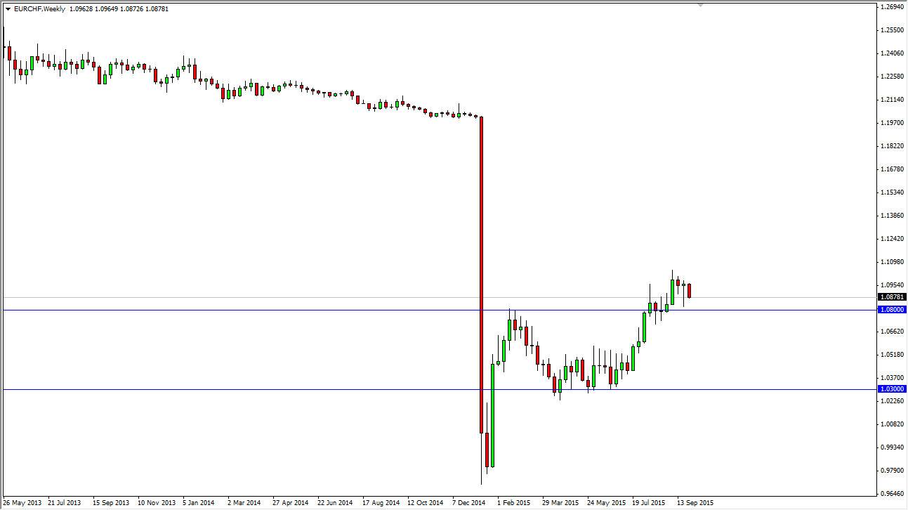 The EUR/CHF pair fell during the course the week but remains well above the 1.08 handle. Because of this, the market looks as if it is going to try to find some type of support below to turn things back around and form a positive move. With this, we should see buyers come back so therefore I am a buyer of this particular pair. The 1.10 level above getting broken to the upside should send this market looking for the 1.20 level given enough time.