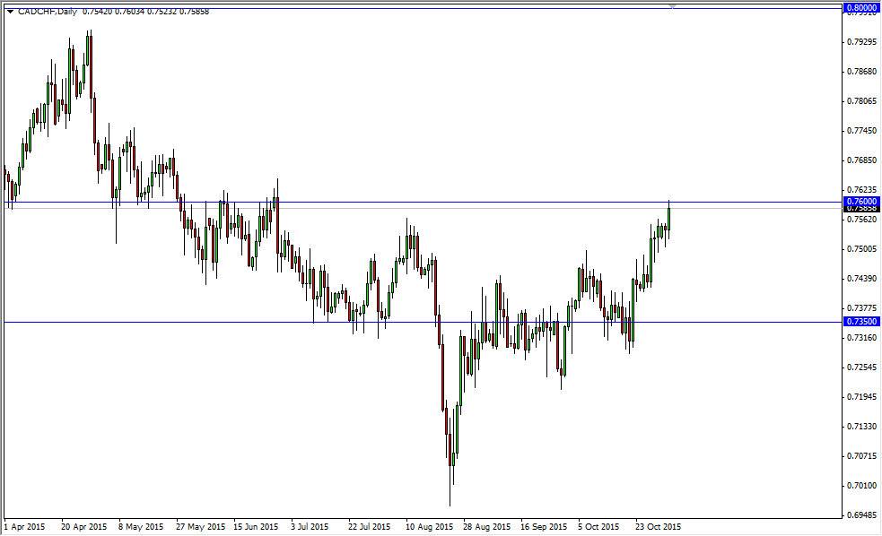 The CAD/CHF pair initially tried to fall during the course of the session on Tuesday, but as we had formed a hammer on Monday, it did suggest that we were going to go higher. We ultimately did, crashing into the 0.76 resistance barrier. This is an area that’s been resistance previously, specifically during the summer, and as a result it’s very likely that sellers will be attracted to this area, but if we can get above there it’s more than likely going to be a move that continues to go much higher. After all, the 0.80 level is the next major resistance barrier, and that gives is plenty of room to move. Having said that though, I do recognize that there is a significant amount of noise just above the 0.76 level, so I am not looking for a quick move to that level.