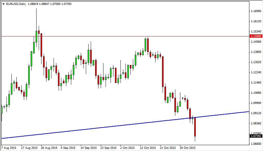 The uptrend line has been broken, and that of course is very bearish. The bottom of the hammer being broken from Thursday of course is very bearish as well. Also, we have the 1.08 level which should have been supportive and instead only got sliced through. Because of this, it’s only a matter of time before the selling pressure overwhelms the market and we go to the next significant supportive level which I see as the 1.08 handle. I also believe that selling rallies from time to time might be the way to go as well, as long as we get some type of exhaustive candle above. The bottom of the uptrend line should be resistive as well, so having said that it’s very likely that the sellers will continue to push this in market around. Ultimately, I believe that there are far too many bearish indicators right now to consider buying this particular market. Downward we go.