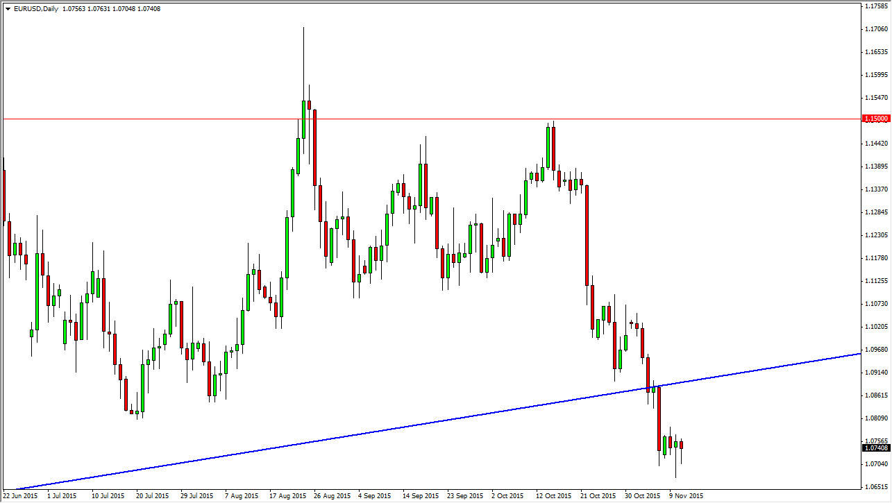 Keep in mind that the central banks continue to diverge as far as interest-rate expectations are concerned. The European Central Bank has recently stated that stimulus is most certainly on the table again, and that of course spooked the market and pushed the value of the Euro down. With that being the case, we then found ourselves with a stronger than anticipated employment number coming out of the United States. That puts pressure back on the Federal Reserve to raise interest rates in America, so it makes sense that we continue to go lower. There are other things that concern the market as well, as there seems to be quite a bit of volatility and uncertainty in the global economy.