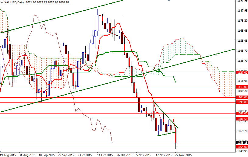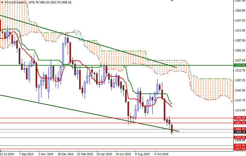 Gold prices settled at their lowest level since November 2, 2009, recoding a sixth consecutive weekly loss, as the dollar's strength continued to weigh on investor sentiment. The market spent most of the month under selling pressure after prices broke below the ascending channel originating in July and closed below the daily Ichimoku cloud. This development put the XAU/USD pair on track to target at $1045. Although prices stalled at $1066 (and formed a triangle during the consolidation period), the bears finally captured this area and tested the support at $1054.