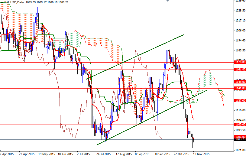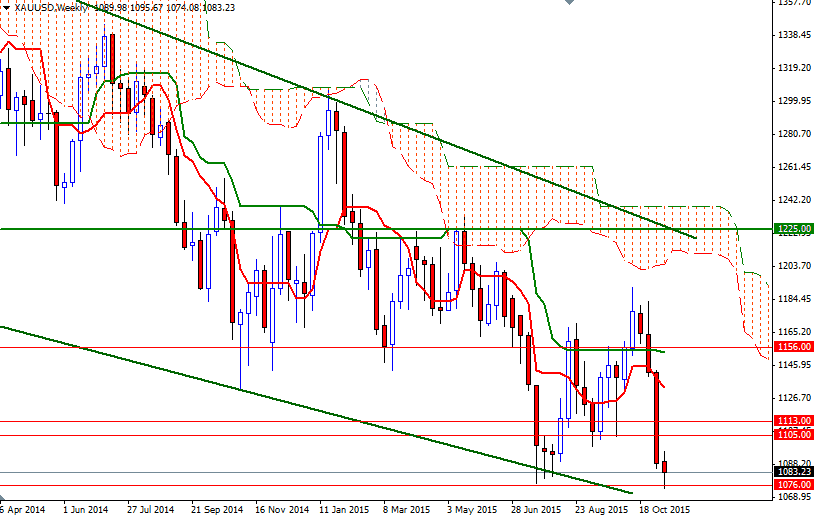 Gold prices fell for a third straight session on Thursday on worries about the possible U.S. rate hike. The XAU/USD pair dipped to a low of 1074.08, a level not seen in more than five years, after dropping through the support in the 1086/2 area put some extra pressure on the market. Recently, growing expectations of a December liftoff by the Federal Reserve have been the main driver of gold but the market may have gotten ahead of itself.