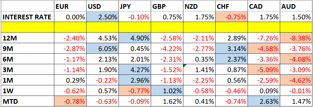 Let’s take a look at the relevant data of currency price changes and interest rates to date, which we compiled using a trade-weighted index of the major global currencies: