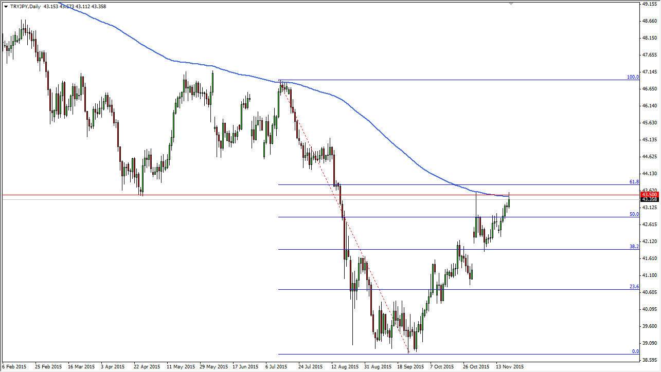 The TRY/JPY pair broke higher during the session on Friday initially, but as you can see struggled at the 43.50 level. This is a pair that I look at yesterday, and as a result I am not surprised that the resistance showed itself at this level. After all, when you look at the chart, you can see that the 61.8% Fibonacci retracement level is just above and that of course is resistive. On top of that, you can see the red line shows clearly where we have seen support and resistance in the past.