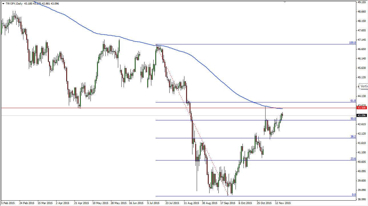 The TRY/JPY pair had a fairly neutral session during the day on Thursday, suggesting that perhaps we are running out of momentum to the upside. You can see that we have recently rallied in a rather significant move from the 39 handle. This pair, while not often traded by many of you is one that I actually prefer. The Turkish lira is of course a currency that people typically will only buy when they feel comfortable with taking risk. The high interest-rate in Turkey of course helps people get involved, and it of course makes for a nice strong positive swap at the end of the day in this marketplace. However, there are several things above that have me a bit concerned about the upward trend.