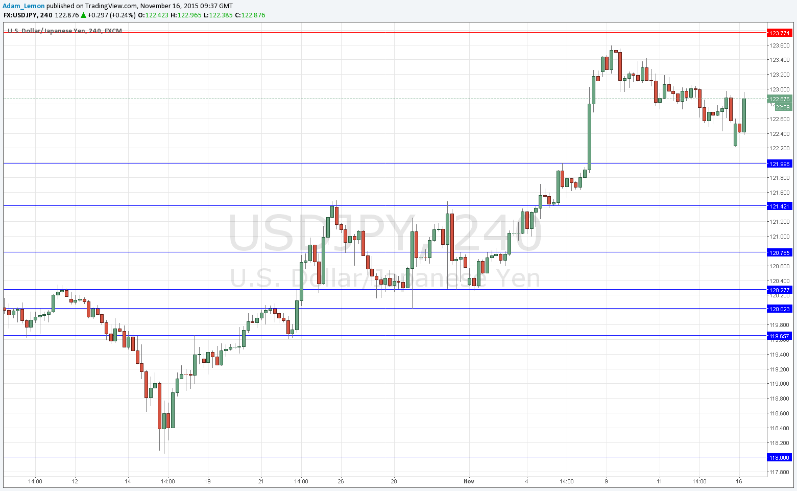 The price opened this week with a small to moderate gap down, but this was quickly filled as the JPY fell somewhat following disappointing Japanese economic data. The price is now threatening minor resistance at the round number of 123.00.