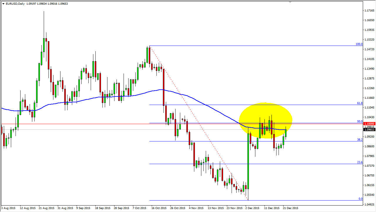 To start with, the 1.10 level is a significant round number. I feel that the round number of course will attract traders as it typically does. Most support and resistance is found at major round numbers, and of course the 1.10 level is certainly major. On top of that, we have the 100 day exponential moving average sitting right here, and as a result I feel that longer-term traders will probably get involved as well. Finally, we have the Fibonacci retracement level, which coincides nicely with the 1.10 handle. At that level, the 50% Fibonacci retracement level lies. Above there, at the 1.11 level, the 61.8% Fibonacci retracement level sets. Because of this, I feel it somewhere in that general vicinity the sellers should get involved.