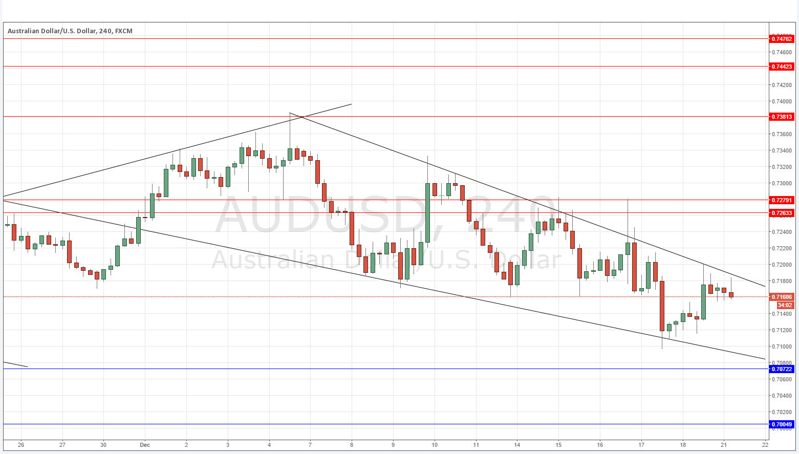 As both trend lines have recently been touched and as the triangle is getting narrower, I am now looking to the horizontal levels. The pair is looking more bearish overall following the U.S. rate hike, so a return to 0.7263 will quite likely provide a good opportunity to go short. However I also think we could get a good bounce at 0.7072 especially if the rejection of that level will happen confluent with a rejection of the lower triangle trend line.
