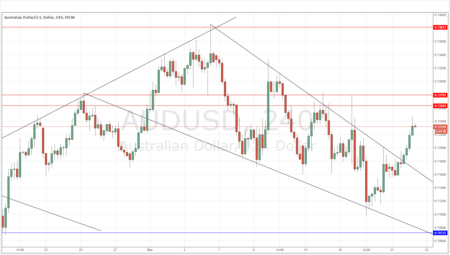 We finally broke up bullishly out of the wedge that had been containing the price very predictably for the past two weeks. We have just reached minor resistance at around the psychologically key 0.7250 area, from which the price may now fall. If it continues up to the resistant zone that begins at 0.7263, that would probably give a great short opportunity. Below, we might get a bullish bounce off the trend line, although the round number at 0.7200 may be supportive first.