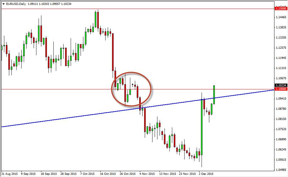The European Central Bank shocked the world when it refused to do aggressive stimulus at the last meeting, as people had fully anticipated it. Because of this, the Euro was suddenly oversold, and as a result the market had to bounce. Quite frankly, I think it is difficult for this market to continue going higher without significant volatility, so any move above the 1.11 level would have to be looked at as a potential long-term trade, and unless you can deal with this type of back and forth type of action, it’s almost impossible to imagine being comfortable with a long position. However, when you change trends, it’s very unlikely that it’s going to be an easy trade, and it’s at times like this where it is most profitable to swim against the tide. Nonetheless, you have to be able to hang onto the longer-term move in order to make any significant profits.
