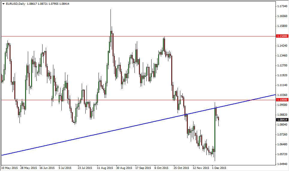 During the session on Monday, the EUR/USD pair fell immediately. However, we did bounce off of the 1.08 handle, and as a result should signs of support. I am a bit interested in what has transpired, only because the 1.08 level has previously been supportive in the past. We have the ascending triangle which as you can see is still marked on my chart via the blue uptrend line. This is confirmed resistance from the massive move on Friday, but it appears that the market is going to try to make a serious attempt to break above there. If we do, that of course would mean something.