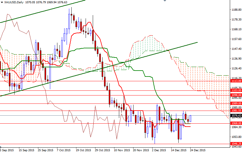 Gold settled up $6.58 at $1076.63 on Thursday, snapping a two-session losing streak, as weakness in the U.S. dollar helped increase demand for the precious metal. The ability to hold above 1068 pushed the XAU/USD pair higher as expected and consequently the resistance in the 1076.90-1075.80 zone was tested. Apparently the market is finding some support from short-covering as big investors lock in gains before the year’s end.