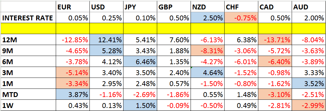 Let’s take a look at the relevant data of currency price changes and interest rates to date, which we compiled using a trade-weighted index of the major global currencies: