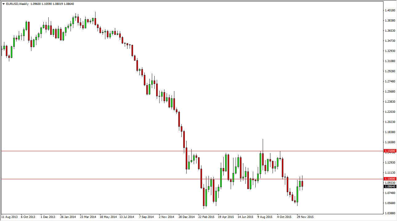 The EUR/USD pair had a slightly negative week, completely wiping out the previous week. It appears that the 1.10 level will continue to bring in sellers, so I feel this point in time will more likely continue to bounce around between the 1.08 level on the bottom, and the 1.11 level on the top. I think short-term range bound trading is probably going to be the theme going forward.