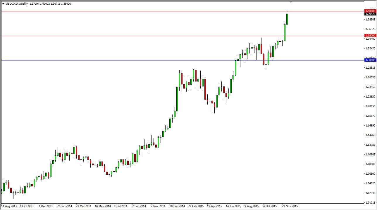 The USD/CAD pair finally touched the 1.40 level during the course of the week. This is a market that I think should continue to go higher over the longer term, but at this point in time may very well need to pullback in order to build up momentum. That pullback should be looked at as value and a buying opportunity in the US dollar. I have no interest whatsoever in selling this market and believe that we will continue higher.