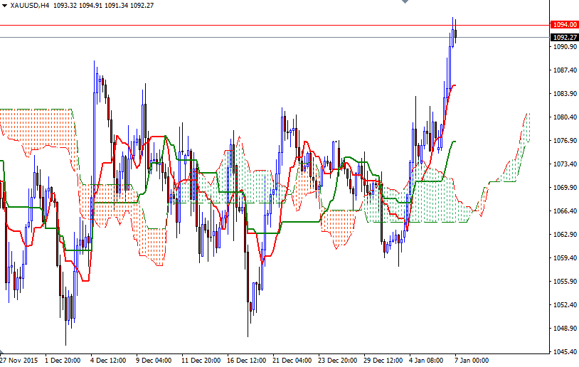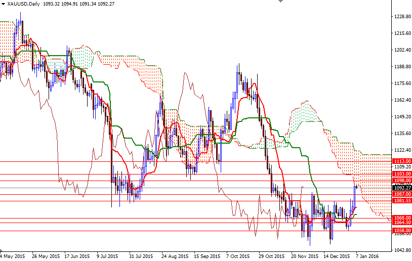 Technical buying pressure was also behind gold's jump yesterday. Breaking through the 1081.55 resistance triggered a fresh round of buying and pushed prices beyond the 1089/7 region. As I mentioned earlier in the week, positively aligned Tenkan-Sen (nine-period moving average, red line) and Kijun-Sen (twenty six-period moving average, green line) lines on both the daily and 4-hourly charts, along with Chikou Span/Price cross in the same direction level improved the short-term technical picture.
