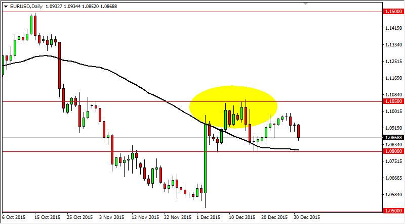 The EUR/USD pair fell during the session on Thursday as we continue to grind away in the previous consolidation region. I believe that the 1.08 level is supportive, and as a result I do not look for this market to break down below it. I have the 50 day exponential moving average on the chart and it is flattening right at that level now. On top of that, the 1.08 level has offered support previously, so by virtue of market memory, I believe that it’s only a matter of time before the support starts to strengthen.