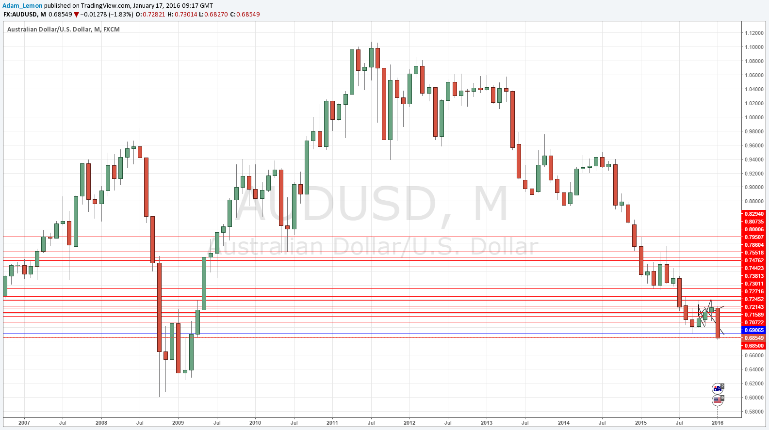The monthly chart below shows how we broke down past the year’s low at 0.6907 earlier this week, falling to a new 5 year low. The price has closed close to its low which is a very bearish sign. However there may be some support here at around 0.6850 as it was previously a key monthly high.