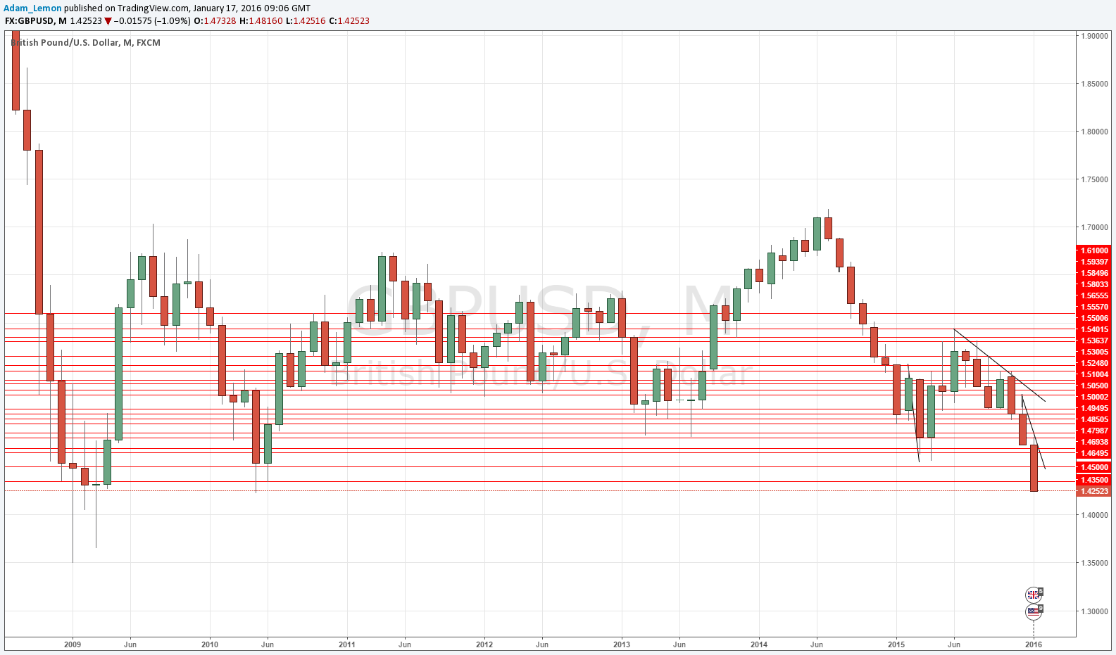 The price is in a clear, long-term downwards trend, making new lows and breaking through support. In fact the pair made new 5 year lows last week only about 20 pips away from the lowest prices since 2009, as can be seen in the monthly chart below. The price also closed the week right on its low which adds to the bearish picture. It is hard to know where the next support might be, although the 2010 low of 1.4226 might be important.