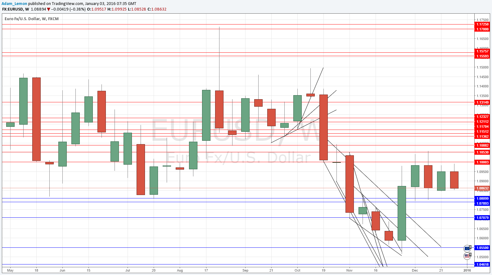 The weekly chart below shows something very similar to USD/CHF, which is not surprising as CHF and EUR are so highly positively correlated. However I am more cautious here than I am with USD/CHF because we can see from the chart below there is a significant area of support at around 1.0800 that is very strong and crucial. I think we will get down there, but whether we will break down past it is another question. Note how it has acted as both resistance and support a few times over recent months.