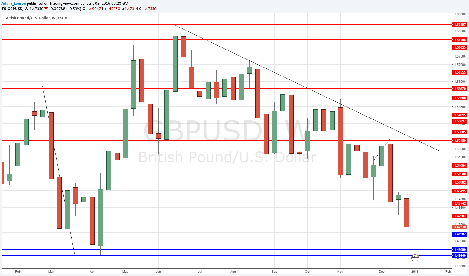 The price is in a clear, long-term downwards trend, making new lows and breaking through support at around 1.4800 that held for a few days. The price also closed the week right on its low which adds to the bearish picture. We are getting close now to the lows you can see on the left of the chart which are actually multi-year lows. There is a first level of support at around 1.4700 but the area around 1.4600 to 1.4564 will probably see a meaningful rebound and profit-taking, so it may be hard to move below those prices.